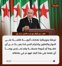 تبون: علاقات الجزائر مع موريتانيا قائمة على الأخوة والاحترام المتبادل