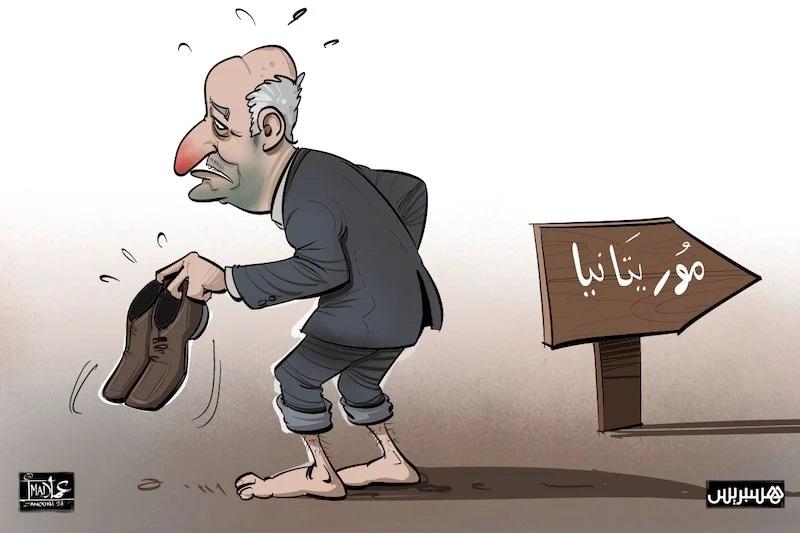 وصور الكاريكاتير موريتانيا أرضا صحراوية خالية من أي معالم، ومليئة بالغبار، فيما صور الرئيس الجزائري عبد المجيد تبون وهو يغادرها حافي القدمين، ومصابا بالزكام.