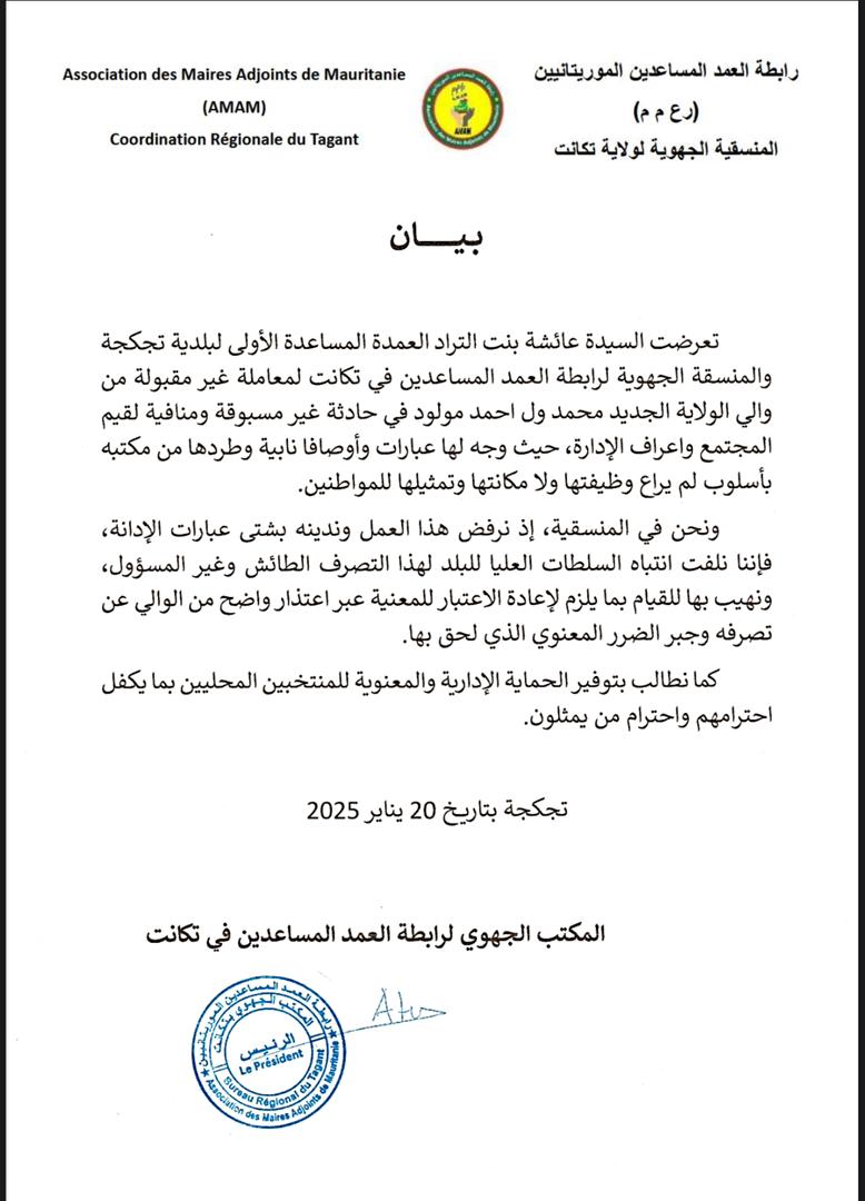 قالت المنسقية الجهوية لرابطة العمد المساعدين في ولاية تكانت إن الوالي الجديد محمد ولد أحمد مولود "وجه عبارات وأوصاف نابية للعمدة المساعد لبلدية تجكجة عائشة منت التراد.