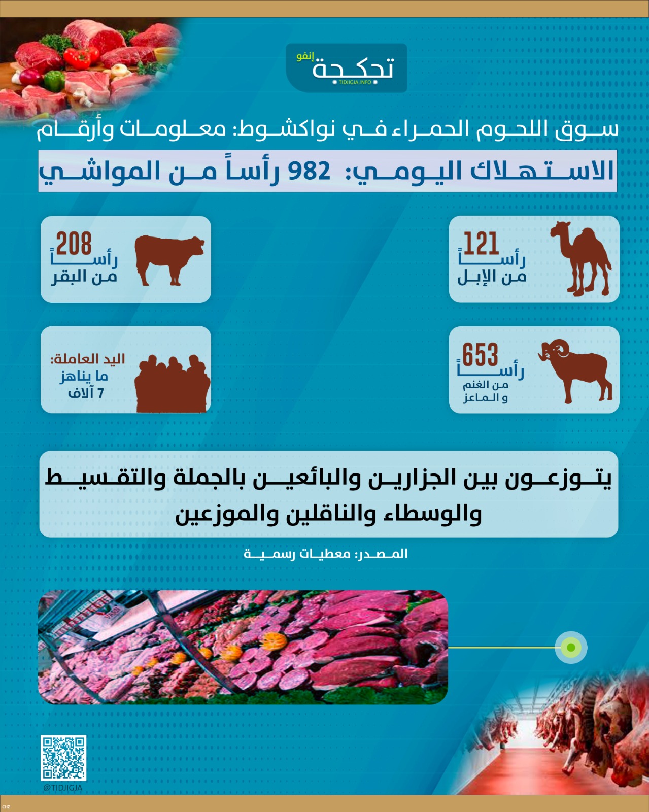 أظهرت معطيات رسمية أن الاستهلاك اليومي من اللحوم الحمراء في العاصمة نواكشوط يبلغ 982 رأساً من المواشي.