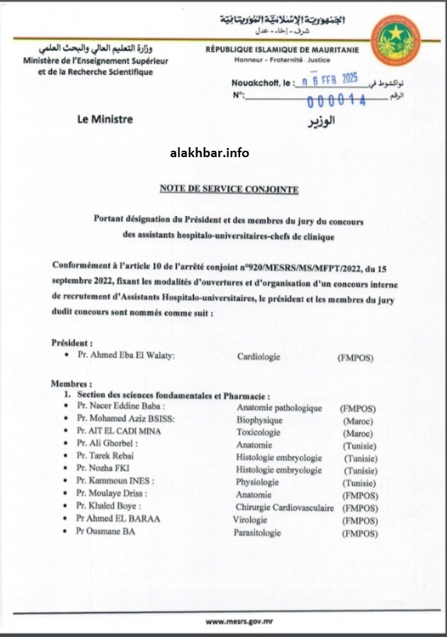أطلقت الاثنين بالعاصمة نواكشوط مسابقة لاكتتاب 66 من الأساتذة الاستشفائيين الجامعيين المساعدين لصالح كلية الطب والصيدلة وطب الأسنان بجامعة نواكشوط، وذلك بعد تأجيلها مرات سابقة.