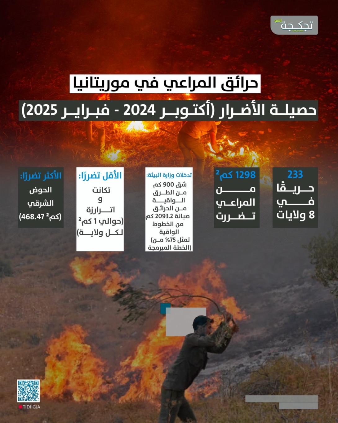 قالت وزارة البيئة إن موريتانيا سجلت 233 حريقًا في المراعي، في 8 ولايات، بين أكتوبر 2024 وفبراير 2025.