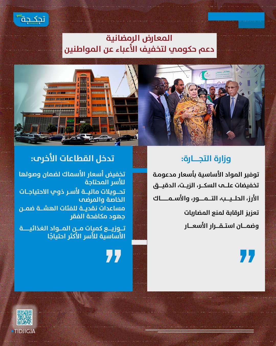 أطلقت وزارة التجارة -نهاية الأسبوع المنصرم- المعارض الرمضانية تحت إشراف الرئيس محمد ولد الشيخ الغزواني، بهدف تخفيف الأعباء عن المواطنين في الشهر الكريم.