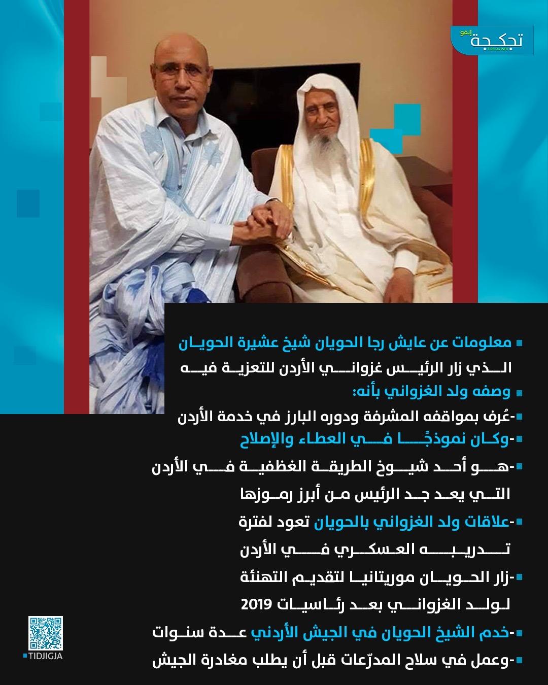 تداولت وسائل الإعلام المحلية بشكل واسع اسم الشيخ عايش رجا الحويان شيخ عشيرة الحويان بعد سفر الرئيس محمد ولد الشيخ الغزواني إلى الأردن للتعزية فيه.