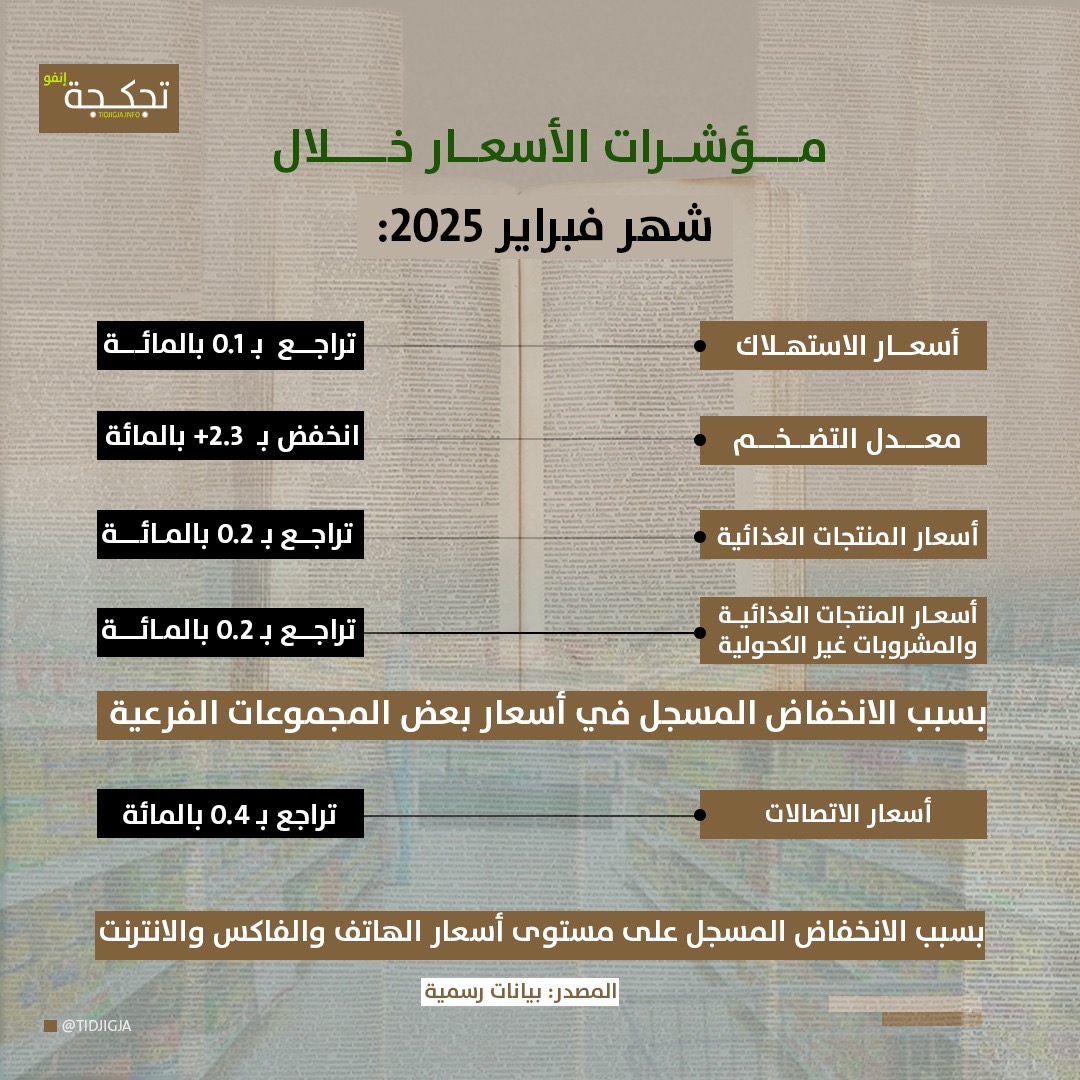 ويشير تقرير الوكالة إلى أن معدل التضخم خلال الاثني عشر شهرا الماضية وصل إلى 2.3+ بالمائة، وعلى أساس سنوي يواصل هذا المعدل تراجعه منذ ثمانية أشهر ليصل إلى 0.8+ بالمائة، خلال شهر فبراير 2025.