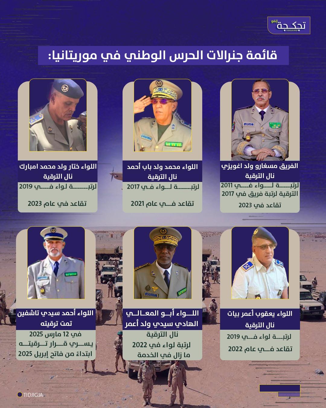 وينضم اللواء ولد تاشفين إلى قائمة جنرالات الحرس الوطني التي تضم كلاً من: