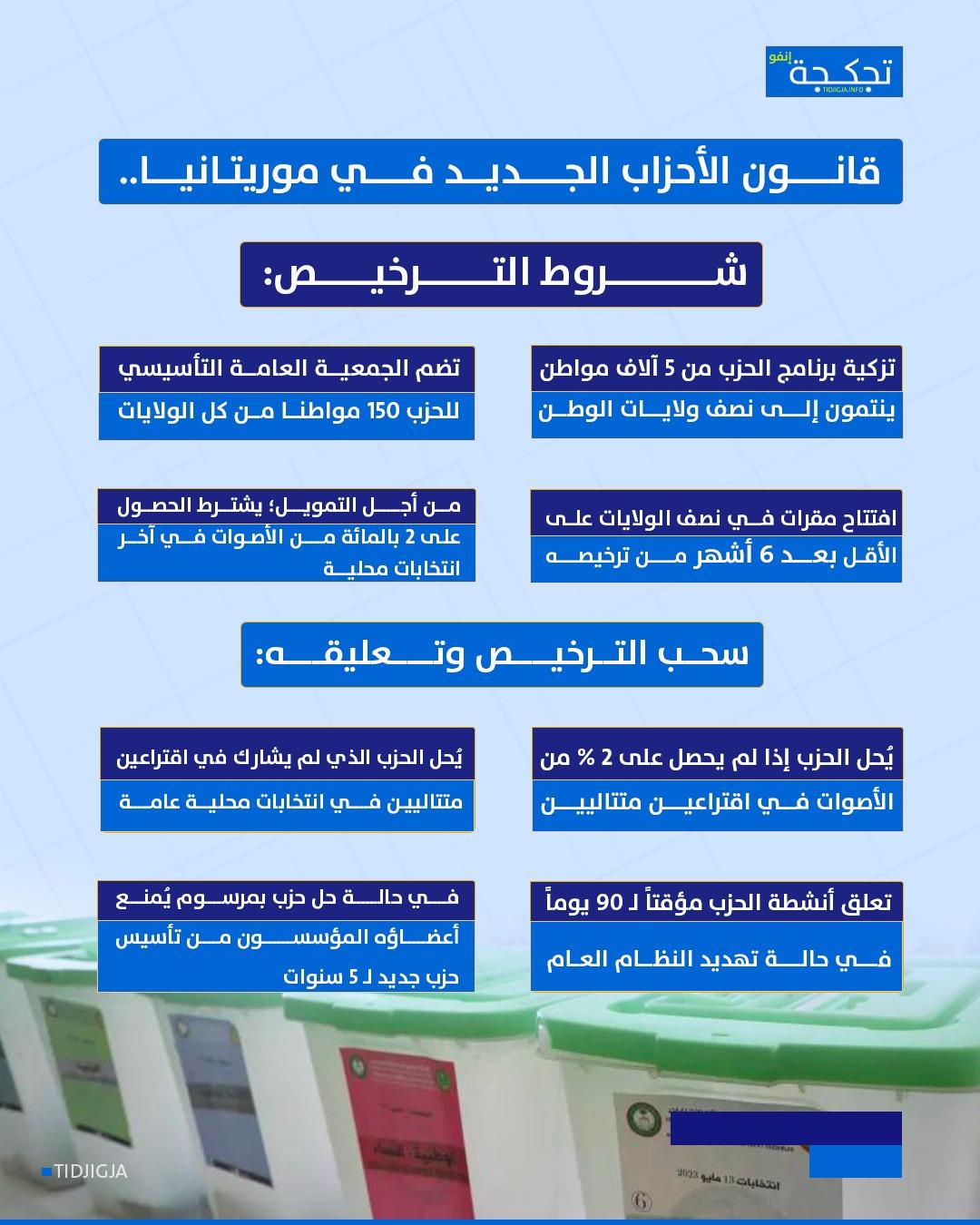 يطرح قانون الأحزاب الجديد في موريتانيا جملة من الشروط لنيل الترخيص، من بينها تزكية برنامج الحزب من خمسة آلاف مواطن ينتمون إلى نصف ولايات الوطن.