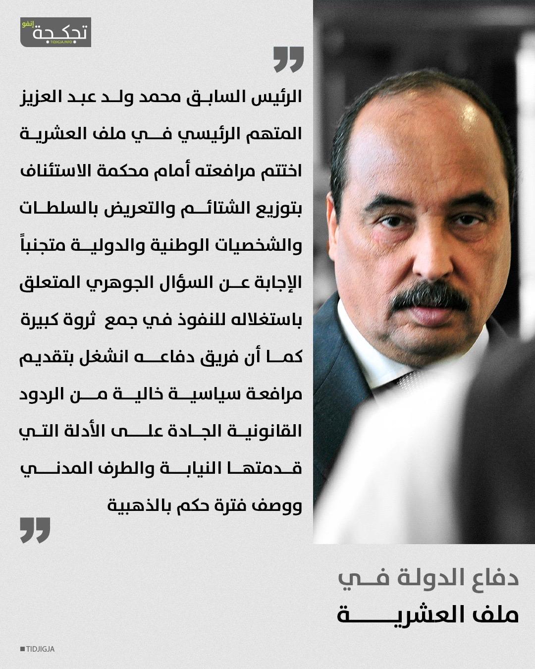 قال فريق الدفاع عن الدولة الموريتانية في"ملف العشرية" إن الرئيس السابق محمد ولد عبد العزيز المتهم الرئيسي في ملف العشرية اختتم مرافعته أمام محكمة الاستئناف بتوزيع الشتائم والتعريض بالسلطات والشخصيات الوطنية والدولية.