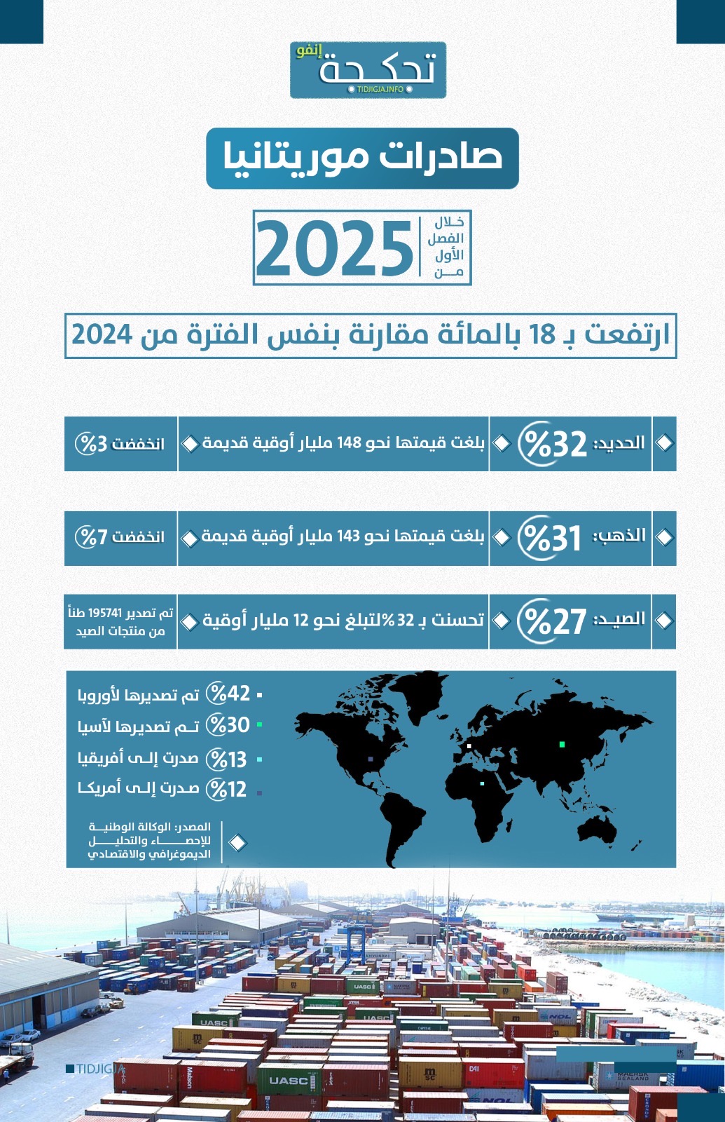 ارتفعت الصادرات الموريتانية خلال الفصل الأول من 2025 بنسبة 18 بالمائة، مقارنة بنفس الفترة من السنة الماضية.