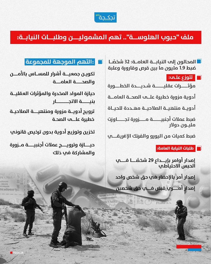 وجهت النيابة العامة عدة تهم للمشمولين في ملف حبوب الهلوسة بينها تكوين جمعية أشرار بهدف المساس بالأمن والصحة العامة، الحيازة غير المشروعة للمواد المخدرة والمؤثرات العقلية بنية الاتجار، ترويج أدوية مزورة ومنتهية الصلاحية تُشكل خطرًا على الصحة العامة.