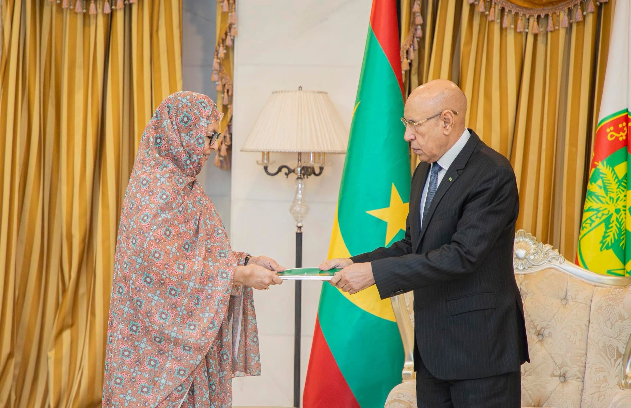 تسلم الرئيس محمد ولد الشيخ الغزواني، اليوم الاثنين، بالقصر الرئاسي في العاصمة نواكشوط، التقرير السنوي للمرصد الوطني لحقوق المرأة والفتاة، من رئيسته مهلة أحمد طالبنا.