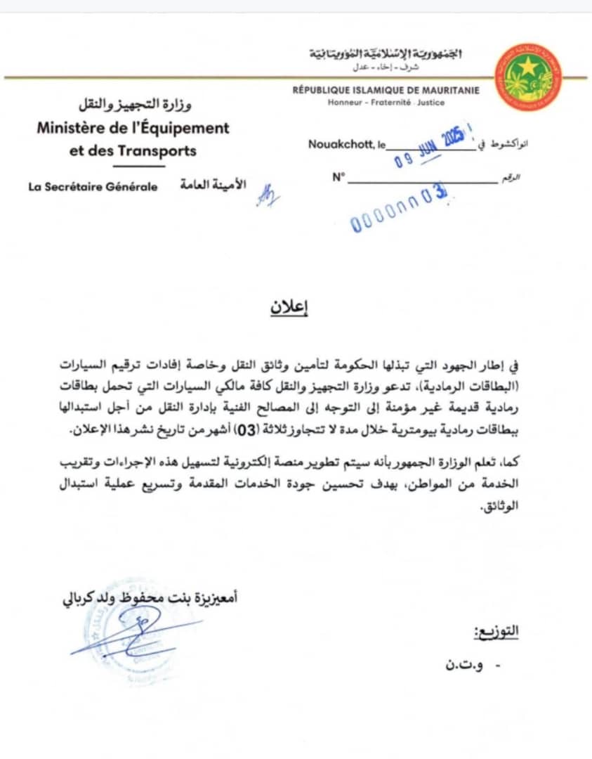 دعت وزارة التجهيز والنقل ملاك السيارات التي تحمل بطاقات رمادية قديمة غير مؤمنة إلى التوجه إلى المصالح الفنية بإدارة النقل من أجل استبدالها ببطاقات رمادية بيومترية خلال مدة لا تتجاوز ثلاثة أشهر من تاريخ نشر هذا الإعلان.