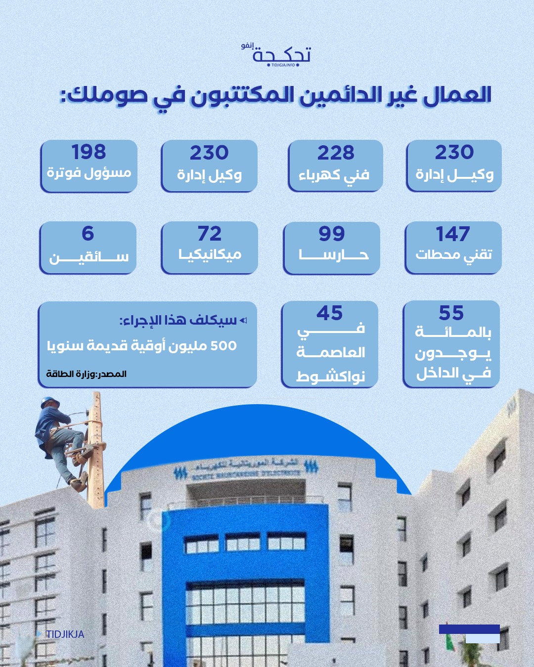 بدأت السلطات إجراءات إدماج العمال غير الدائمين في الشركة الموريتانية للكهرباء "صوملك"، بتكلفة سنوية تصل نصف مليار أوقية.