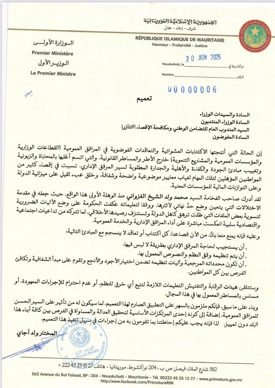 أصدر الوزير الأول المختار ولد اجاي، اليوم الجمعة، تعميما قال فيه إنه يحظر من الآن فصاعدا أي اكتتاب أو تعاقد لا يستجيب لحاجة المرفق العمومي.
