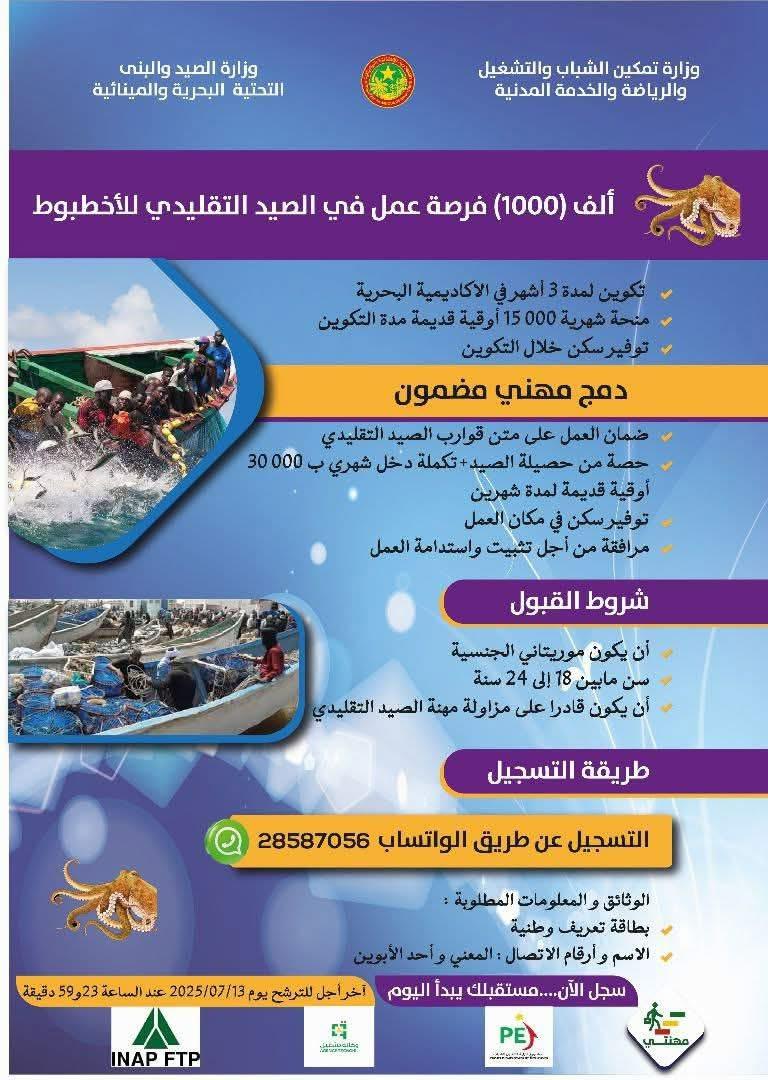 أعلنت وزارة تمكين الشباب فتح التسجيلات للفئتين الثانية والثالثة من برنامج 1000 فرصة تدريبية والإدماج في مجال الحرفيين صيد الأخطبوط بالتعاون مع وزارة الصيد.