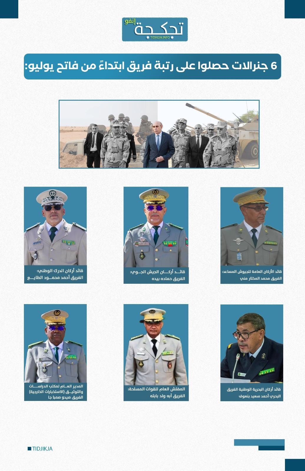 دخلت ترقية ستة جنرالات موريتانيين إلى رتبة فريق حيز التطبيق ابتداءً من يوم أمس الثلاثاء (01 يوليو).