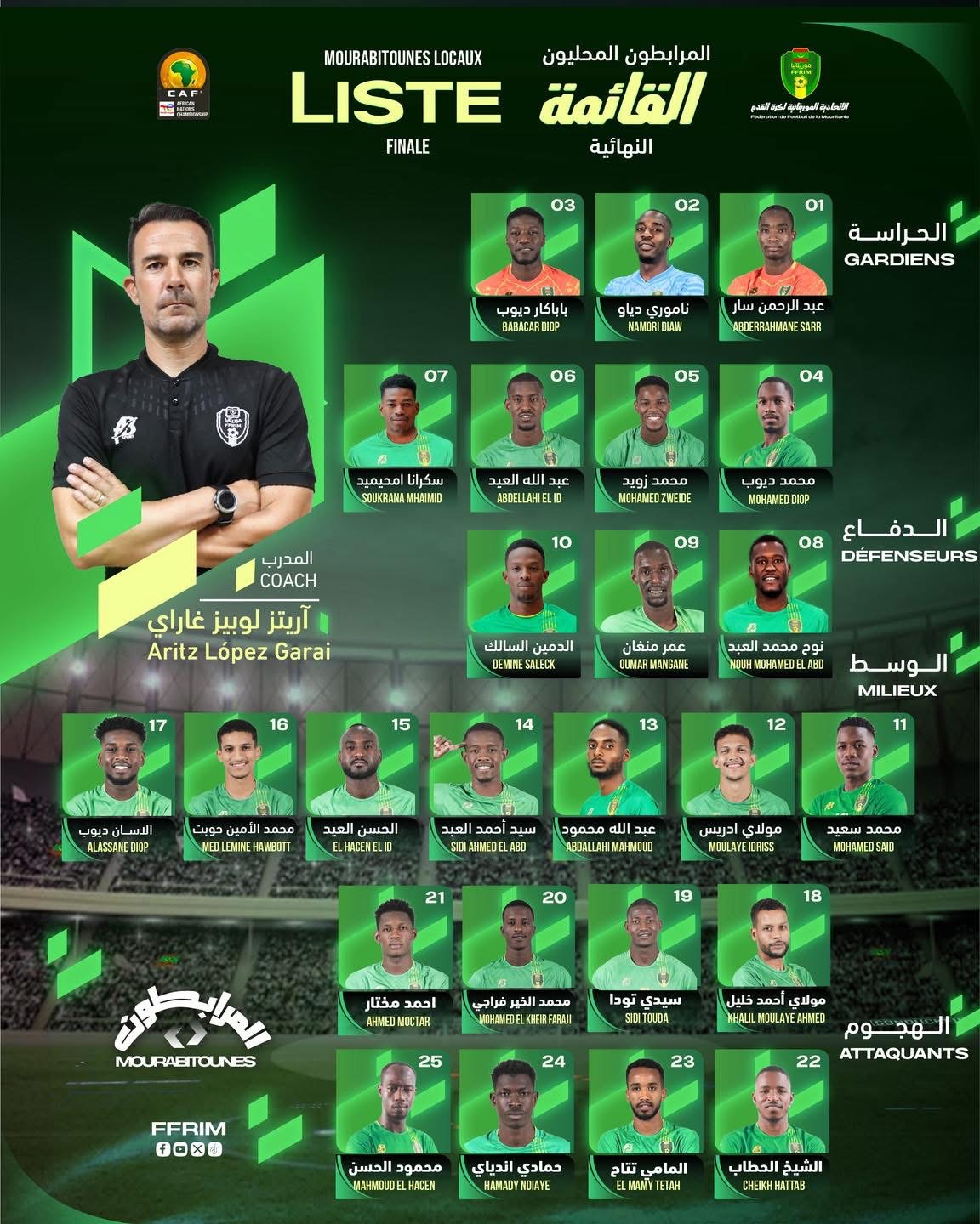 Jul 12 / التعليقات الإعلان قائمة "المرابطون" للمحليين المشاركة في نهائيات بطولة الشان أعلن مدرب المنتخب الوطني للمحليين آرتيز لوبيز غاراي، اليوم السبت، القائمة المشاركة في نهائيات بطولة أفريقيا للأمم 2024.وسيخوض المنتخب عدة حصص تدريبية تمهيداً للبطولة التي تنطلق بداية شهر أغسطس المقبل.القائمة المعلنة في التصميم المرفق: سبت, 2025/07/12 - 12:35
