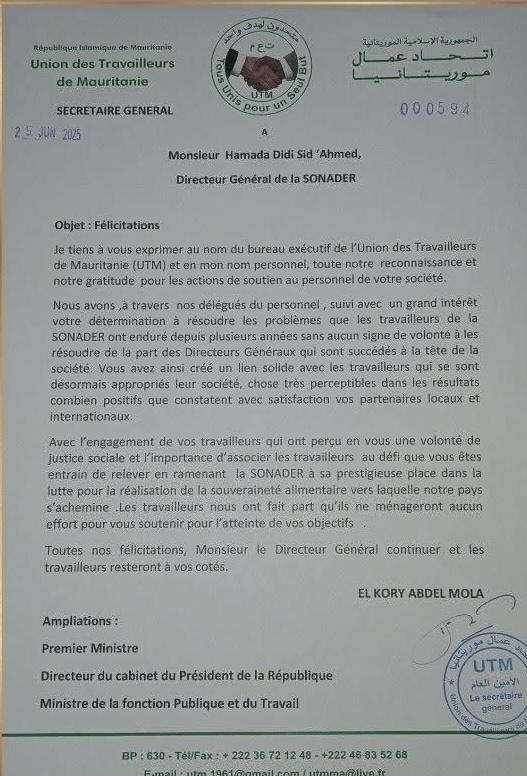 تلقى المدير العام للشركة الوطنية للتنمية الريفية (صونادير)، حماده ديدي سيد أحمد، رسالة تقدير من اتحاد عمال موريتانيا عبّر فيها الاتحاد عن امتنانه للجهود التي تبذلها إدارة صونادير في دعم العمال وتحسين ظروفهم.
