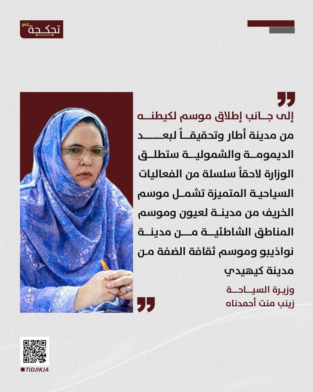 وأكدت الوزيرة أنه إلى جانب موسم لكيطنه في أطار، سيطلق القطاع موسم الخريف من مدينة لعيون وموسم المناطق الشاطئية من مدينة نواذيبو وموسم ثقافة الضفة من مدينة كيهيدي.