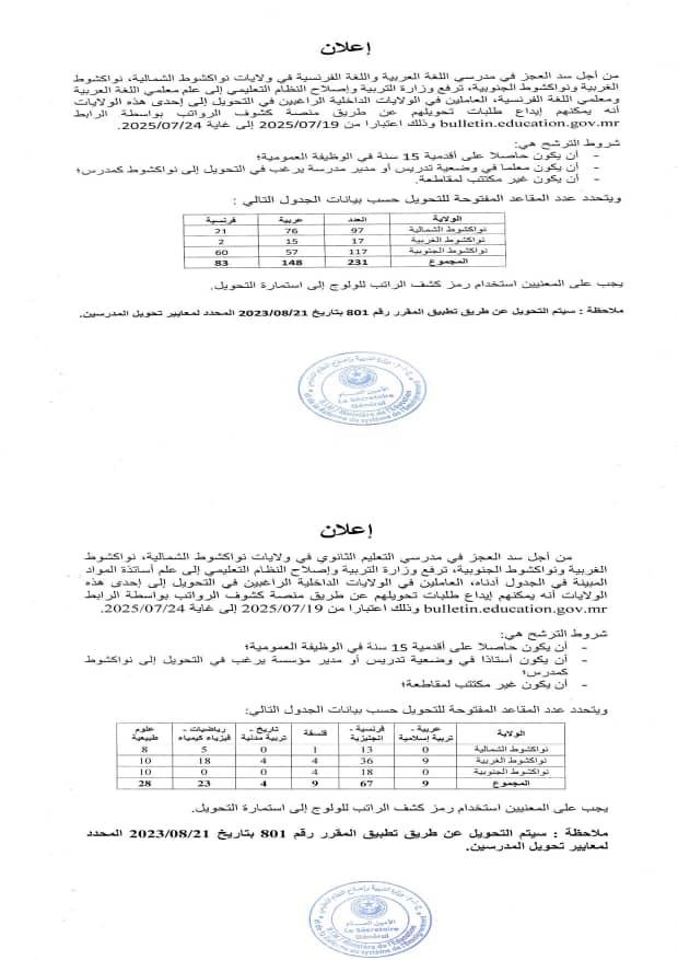 كما اشترطت للمعلمين أن يكونوا حاصلين على أقدمية 15 سنة في الوظيفة، وغير مكتتبين لمقاطعة، وأن يكون الراغب في التحويل في وضعية تدريس أو مدير مدرسة يرغب في التحويل إلى نواكشوط.
