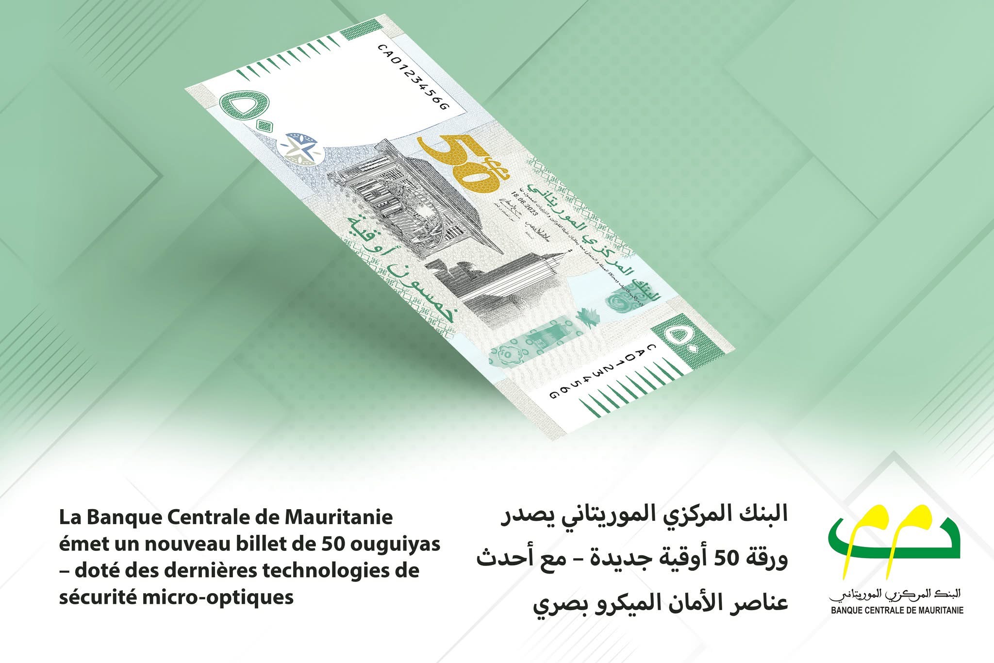 أعلن البنك المركزي الموريتاني، اليوم، عن إصدار نسخة جديدة ومطوّرة من ورقة 50 أوقية، تتميز بمواصفات أمنية وتقنية عالية، وذلك بمناسبة مرور خمسين عامًا على اعتماد الأوقية كعملة وطنية، وفي تتويج لجهود بحثية انطلقت منذ عام 2023.