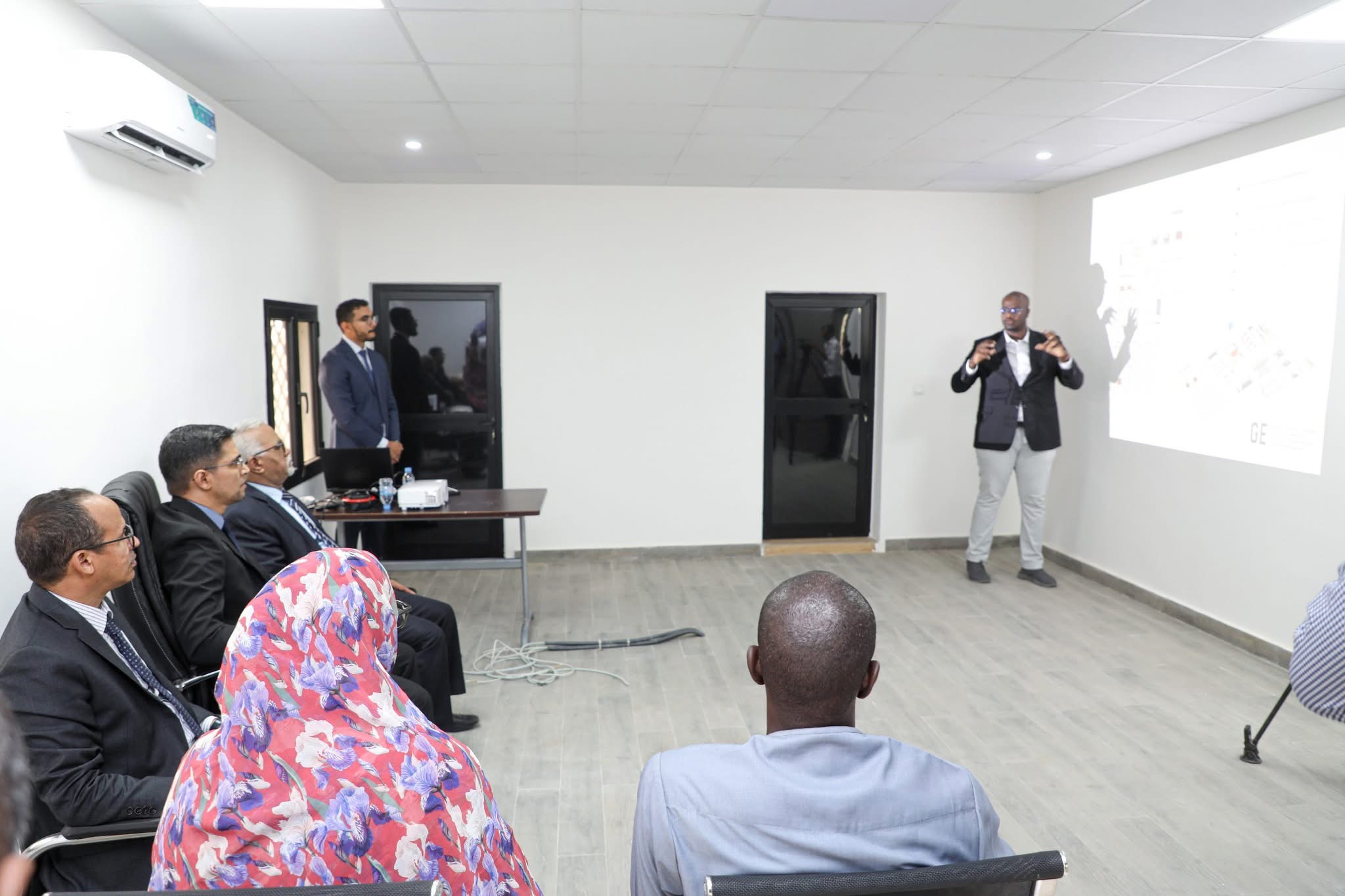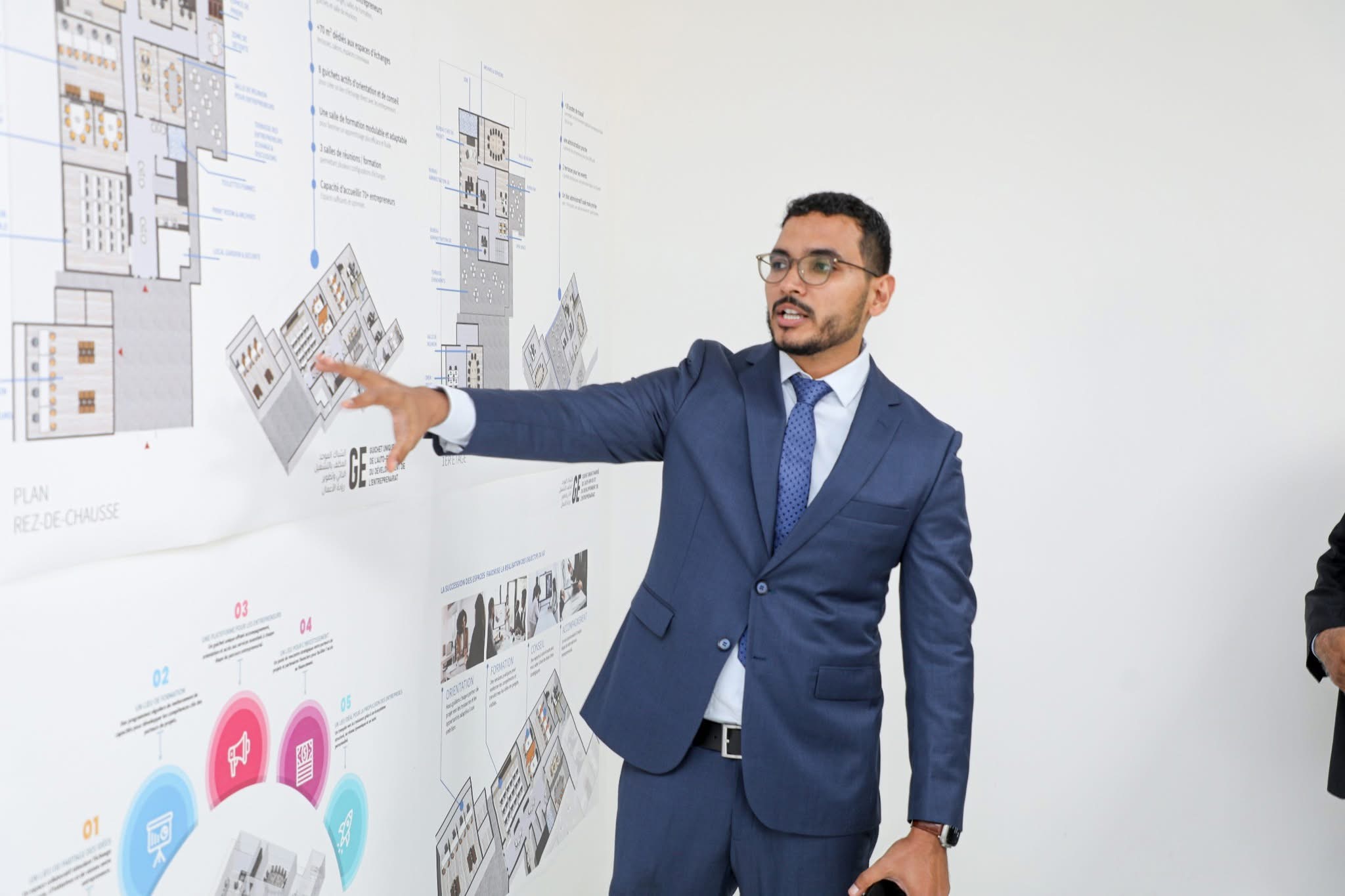 وتابع الوزير عرضاً حول الشباك والأدوار التي يتوقع أن يلعبها في مجال مواكبة رواد الأعمال وأصحاب المشاريع الصغيرة والمتوسطة، كما تابع عرضاً فنياً من المكتب المعماري الذي يتولى تنفيذ التصميم الداخلي لمقر المشروع.