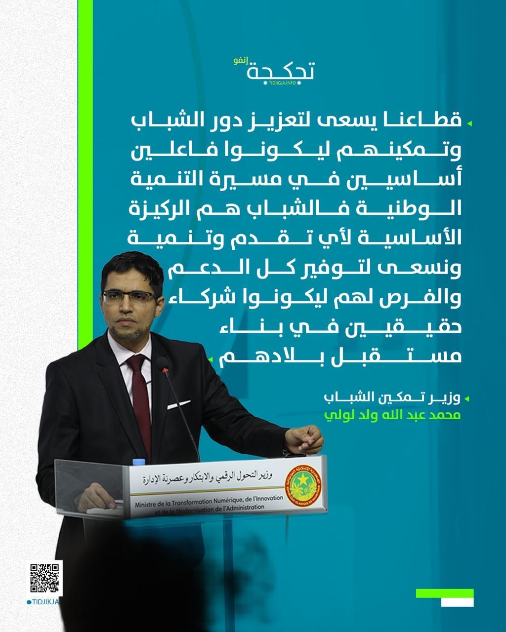 قال وزير تمكين الشباب محمد عبد الله ولد لولي إن الحكومة تسعى لتعزيز دور الشباب وتمكينهم ليكونوا فاعلين أساسيين في مسيرة التنمية الوطنية.