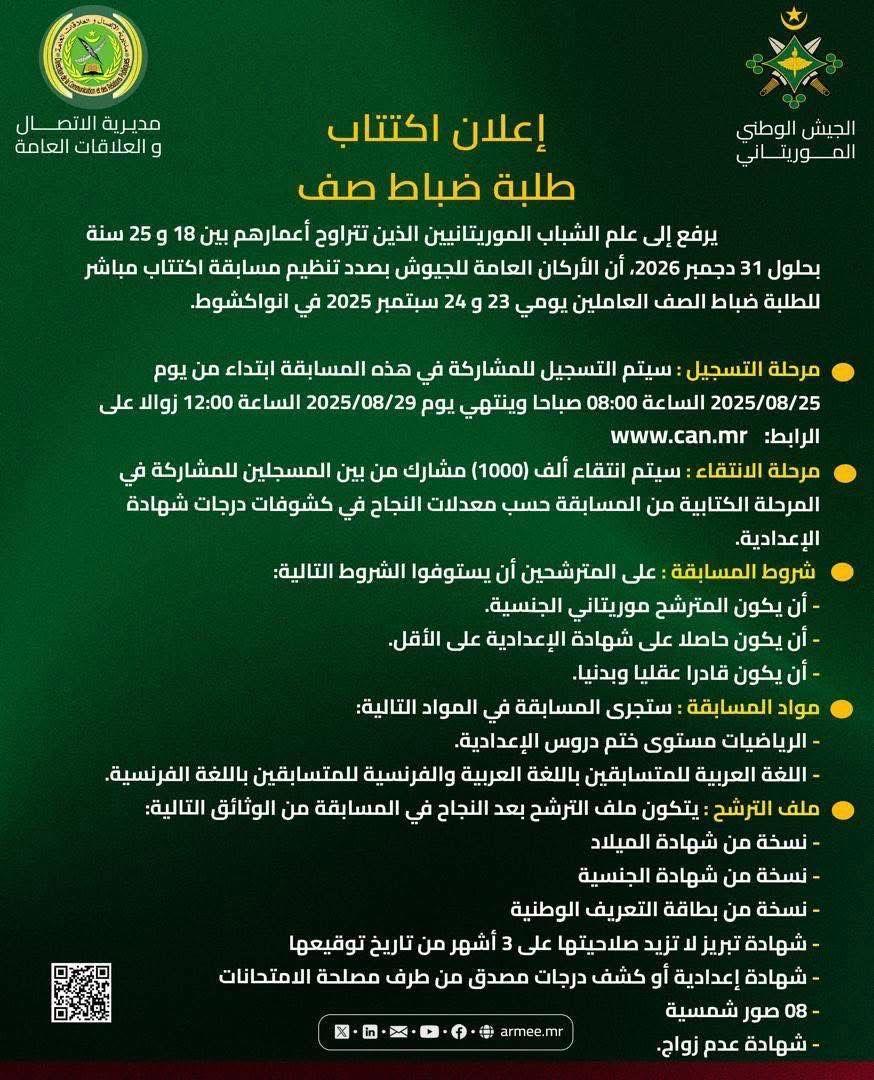 أعلنت قيادة أركان الجيوش عن مسابقة اكتتاب مباشر للطلبة ضباط الصف العاملين ستجرى خلال يومي الـ 23 و 24 سبتمبر القادم في العاصمة نواكشوط.