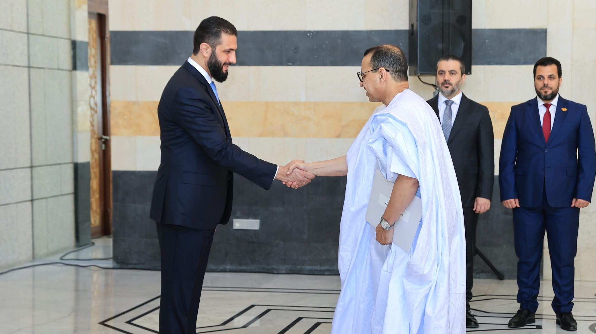 قدم السفير الموريتاني في العاصمة السورية دمشق، الطالب المختار الشيخ محمد المجتبى، أوراق اعتماده للرئيس السوري أحمد الشرع.