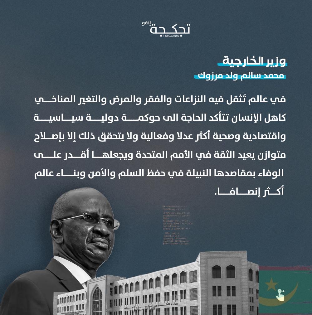 أكد وزير الخارجية، محمد سالم ولد مرزوك، أن التحديات العالمية المتزايدة مثل النزاعات والفقر والأمراض والتغير المناخي، تبرز الحاجة إلى حوكمة دولية أكثر عدلاً وفعالية على المستويين السياسي والاقتصادي والصحي.