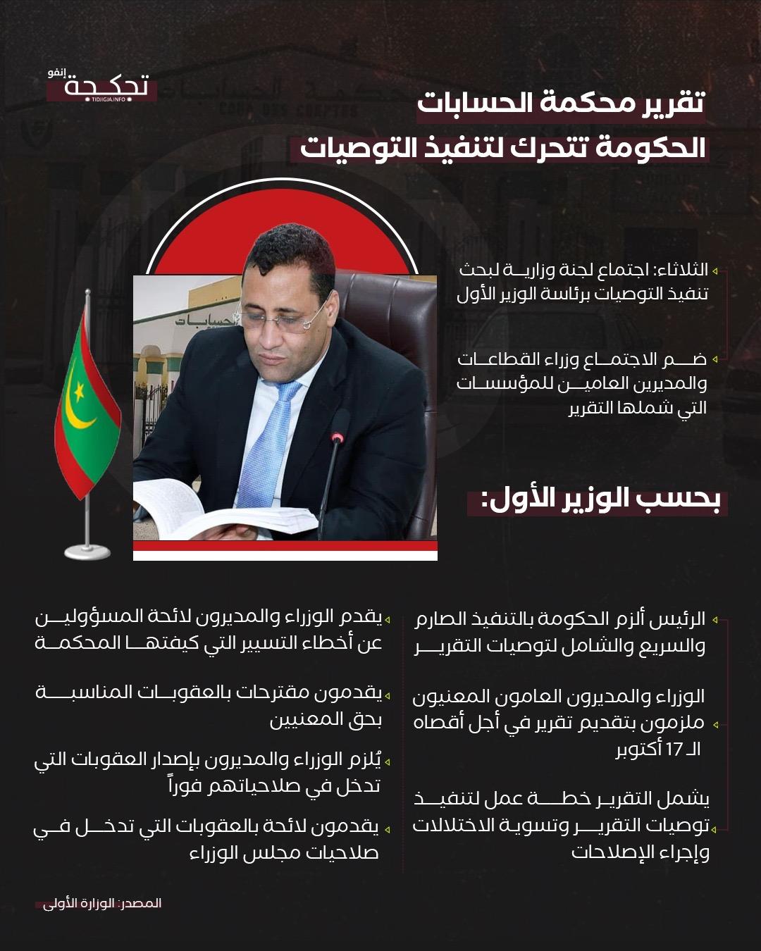 قال الوزير الأول المختار ولد أجاي إن رئيس الجمهورية محمد ولد الشيخ الغزواني ألزم الحكومة بالتنفيذ الصارم والسريع والشامل لتوصيات تقرير محكمة الحسابات، مؤكداً أن الهدف هو تعزيز الشفافية والمساءلة في التسيير العمومي.