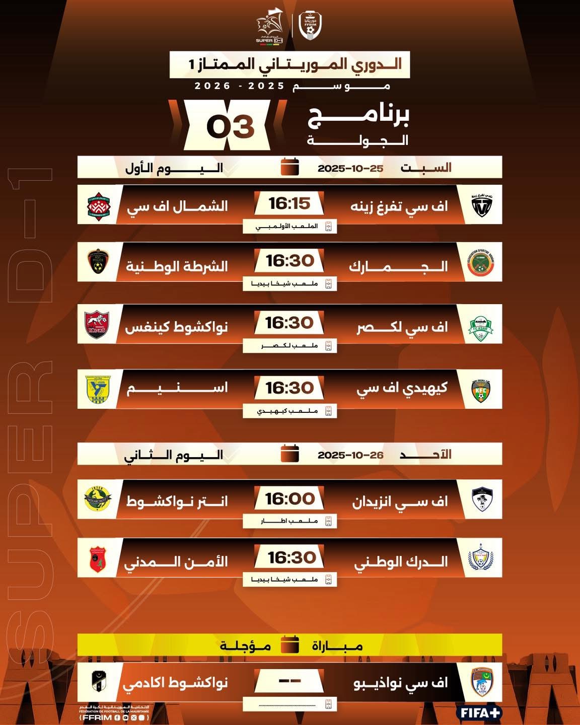 وتم تأجيل مباراة أف سي نواذيبو ونواكشوط أكاديمي، وهي المرة الثانية التي يتم فيها تأجيل مباراة للفريق هذا الموسم.