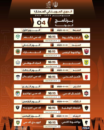 تتجه أنظار جماهير كرة القدم الوطنية إلى الجولة الرابعة من الدوري الوطني التي تنطلق يوم الجمعة بلقاء يجمع إنتر نواكشوط بلكصر، وتتواصل يوم السبت بمباراتين تجمعان نواكشوط كينغس مع الجمارك، واسنيم مع الدرك الوطني.