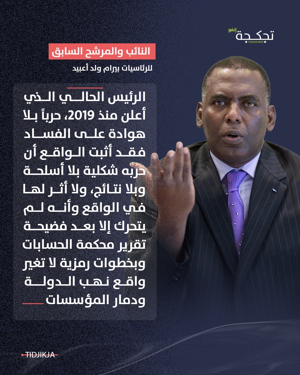 قال النائب والمرشح السابق للرئاسيات بيرام ولد الداه ولد أعبيد إن الرئيس الحالي، الذي أعلن منذ 2019 حرباً بلا هوادة على الفساد، أثبت الواقع أن حربه "شكلية، بلا أسلحة وبلا نتائج، ولا أثر لها في الواقع".
