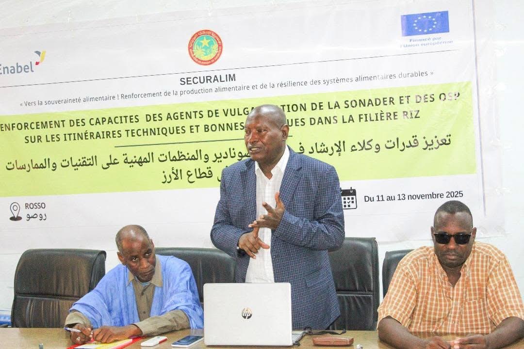نظمت الشركة الوطنية للتنمية الريفية (صونادير) بالتعاون مع الوكالة البلجيكية للتعاون الدولي ورشة تكوينية بمدينة روصو من الـ 11 إلى 13 نوفمبر، تحت عنوان "تعزيز القدرات الفنية للمرشدين الزراعيين على التسلسل الفني والتطبيقات والأساليب الزراعية الجيدة لشعبة الأرز"، بمشاركة مرشدين من ولايات اترارزة ولبراكنه وغورغول وكيديماغا.
