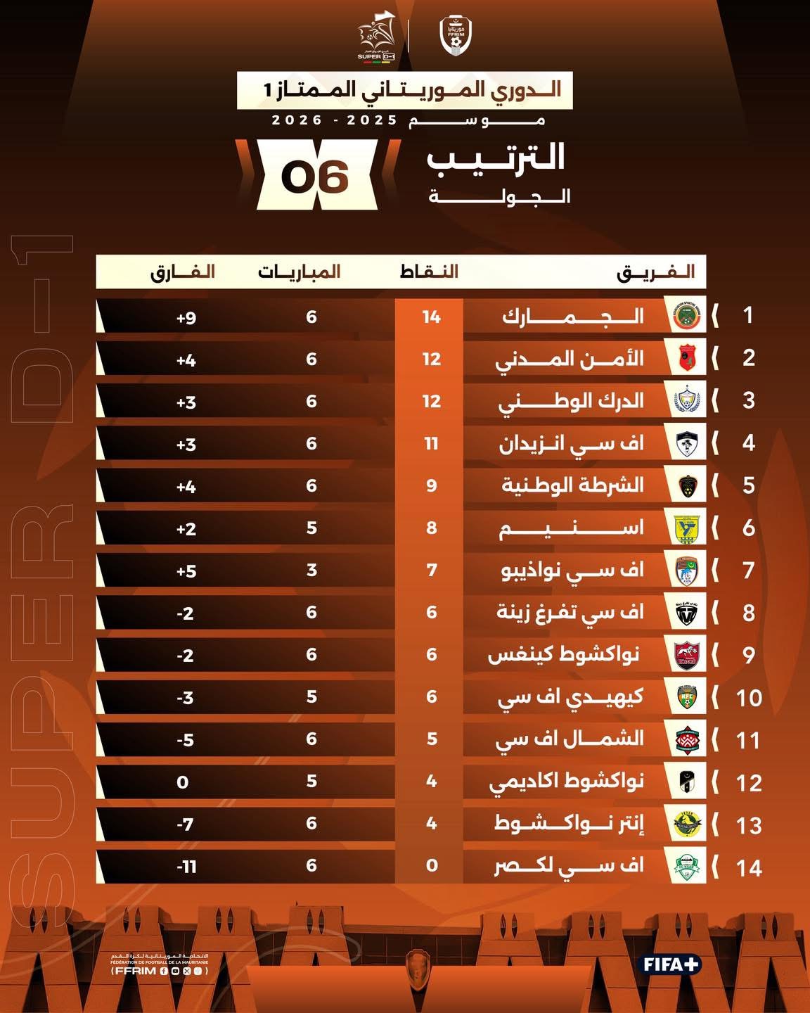 وبات أفسي انزيدان يحتل المركز الرابع برصيد 11 نقطة، وهو الفائز على أكاديمية نواكشوط، أما المركز الخامس فيحتله نادي الشرطة بتسع نقاط وبفارق نقطة واحدة أمام اسنيم الذي يملك مباراة مؤجلة.
