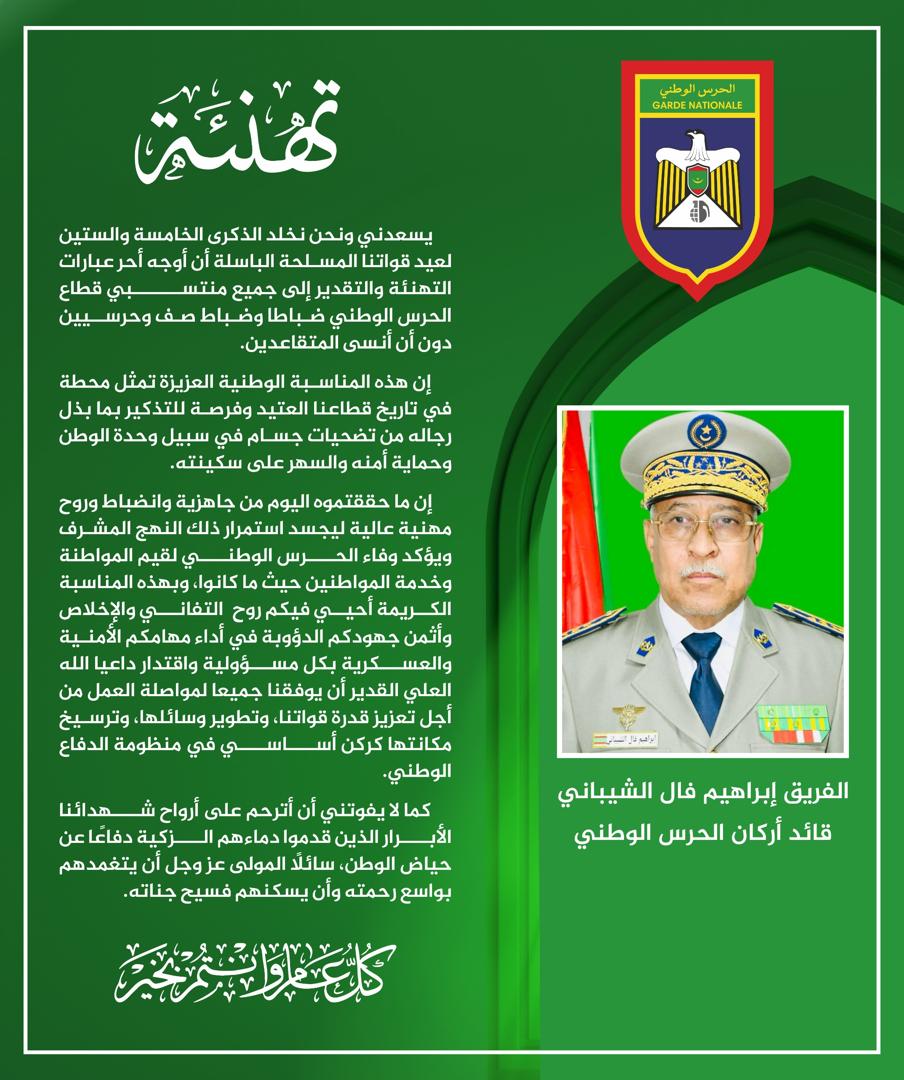 أصدر قائد أركان الحرس الوطني، الفريق إبراهيم فال ولد الشيباني، تهنئة بمناسبة الذكرى الخامسة والستين لعيد القوات المسلحة، عبّر فيها عن تقديره لجميع منتسبي قطاع الحرس الوطني من ضباط وضباط صف وحرسيين، إضافة إلى المتقاعدين.