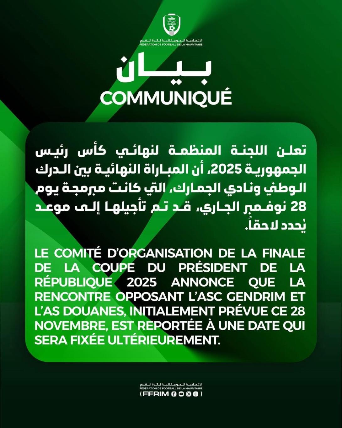 وجاء الإعلان عبر منشور مقتضب للاتحادية الموريتانية لكرة القدم على صفحتها الرسمية في فيسبوك، دون ذكر أي تفاصيل حول أسباب التأجيل.