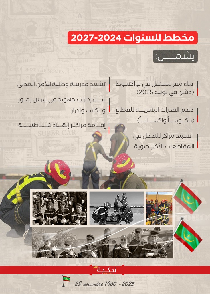 ويعمل القطاع حالياً على تنفيذ مخطط تطويري للسنوات 2024–2027 يشمل بناء مقر مستقل بنواكشوط، وتشييد مدرسة وطنية للأمن المدني، وتعزيز القدرات البشرية، وإنشاء إدارات جهوية في تيرس زمور وتكانت وآدرار، إضافة إلى مراكز تدخل وإنقاذ شاطئي في عدد من المقاطعات الحيوية.