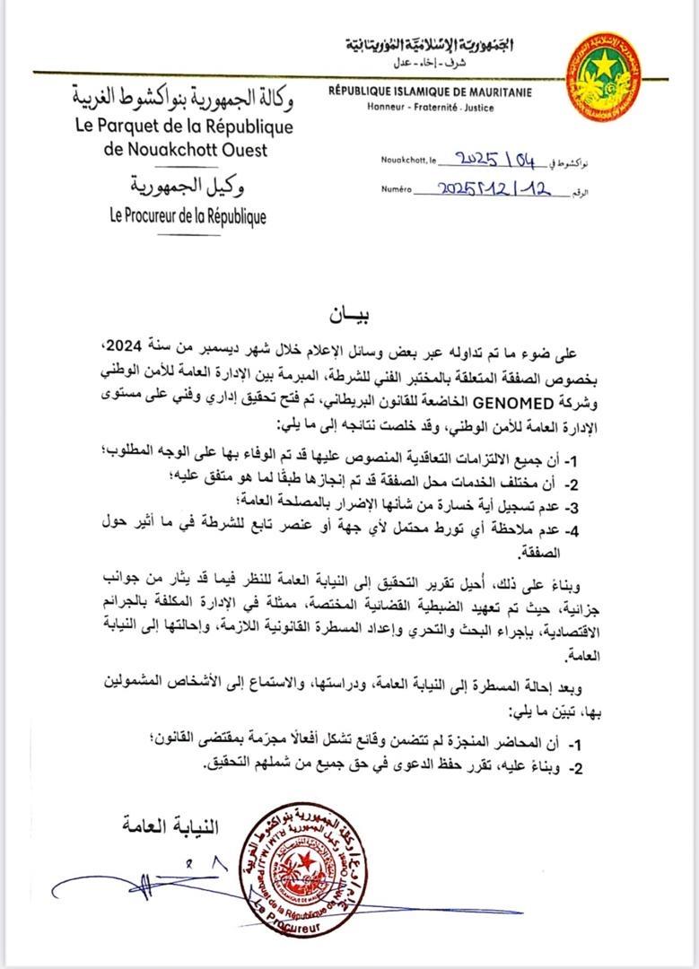 وكانت الإدارة العامة للأمن الوطني قد فتحت تحقيقاً داخلياً عقب ما تم تداوله في بعض وسائل الإعلام خلال ديسمبر 2024 بشأن الصفقة المبرمة مع شركة GENOMED البريطانية، وتوصل التحقيق إلى تنفيذ الالتزامات التعاقدية كما هو مطلوب، وعدم تسجيل أي خروقات أو خسائر، وعدم وجود شبهات تورط داخل الجهاز الأمني.