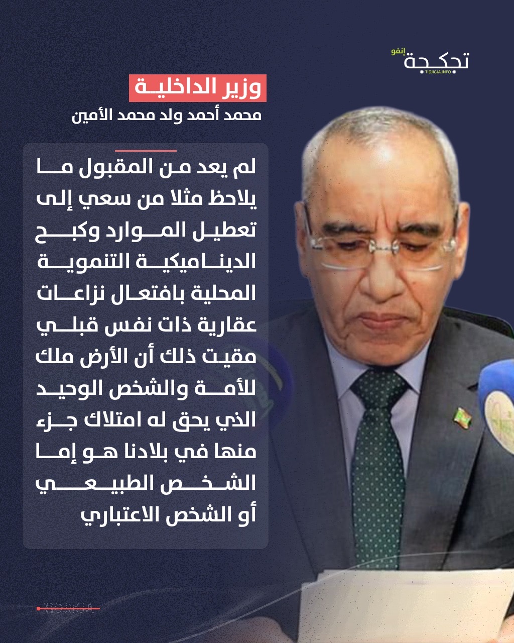 قال وزير الداخلية محمد أحمد ولد محمد الأمين إن ما يُلاحظ من سعي إلى تعطيل الموارد وكبح الديناميكية التنموية المحلية عبر افتعال نزاعات عقارية ذات طابع قبلي أمر لم يعد مقبولًا، لما له من انعكاسات سلبية على الاستقرار والتنمية.