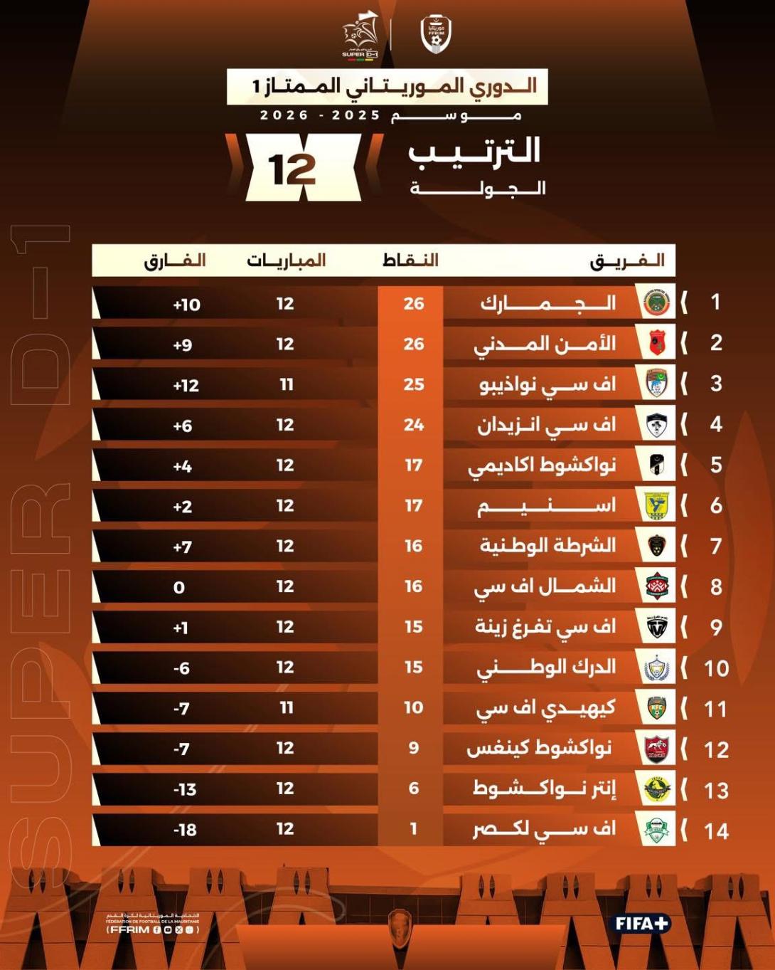 وبات الجمارك في الصدارة برصيد 26 نقطة، متقدماً بفارق الأهداف عن الأمن المدني، ولنقطة واحدة أمام أفسي نواذيبو الذي تراجع للمركز الثالث بعد أن كان متصدراً.