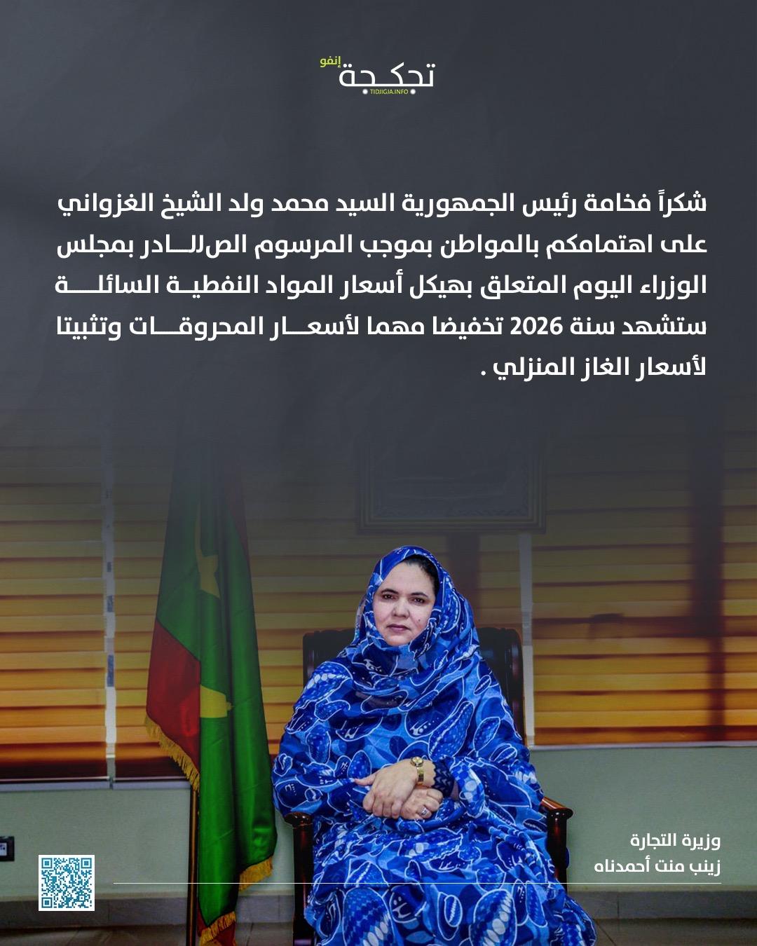 عبّرت وزيرة التجارة زينب منت أحمدناه، عن شكرها وامتنانها لرئيس الجمهورية محمد ولد الشيخ الغزواني، على ما وصفته بالاهتمام المتواصل بقضايا المواطنين وتحسين ظروفهم المعيشية، خاصة ما يتعلق بتخفيف الأعباء المرتبطة بتكاليف الطاقة.