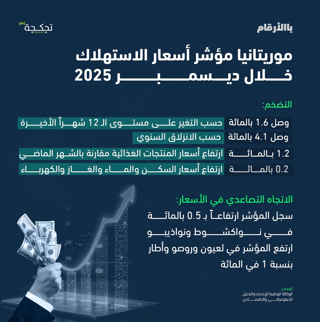 وسجل المؤشر ارتفاعاً قدره 0.5 في المائة في كل من العاصمة نواكشوط ومدينة نواذيبو، وفي المراكز الحضرية الأخرى (لعيون وروصو وأطار) ارتفعت الأسعار بنسبة 1 في المائة.