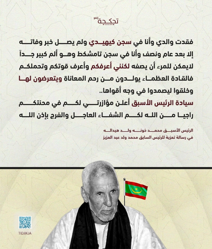 وجّه الرئيس الأسبق محمد خونه ولد هيداله رسالة تعزية ومواساة إلى الرئيس السابق محمد ولد عبد العزيز، عبّر فيها عن تضامنه ومؤازرته له في محنته، مستحضرًا تجربته الشخصية المؤلمة بفقدان والده أثناء وجوده في السجن، وما رافق ذلك من معاناة إنسانية قاسية.