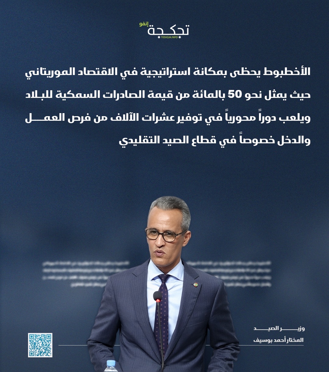 قال وزير الصيد المختار أحمد بوسيف إن الأخطبوط يحظى بمكانة استراتيجية في الاقتصاد الوطني، حيث يمثل نحو 50 بالمائة من قيمة الصادرات السمكية للبلاد.