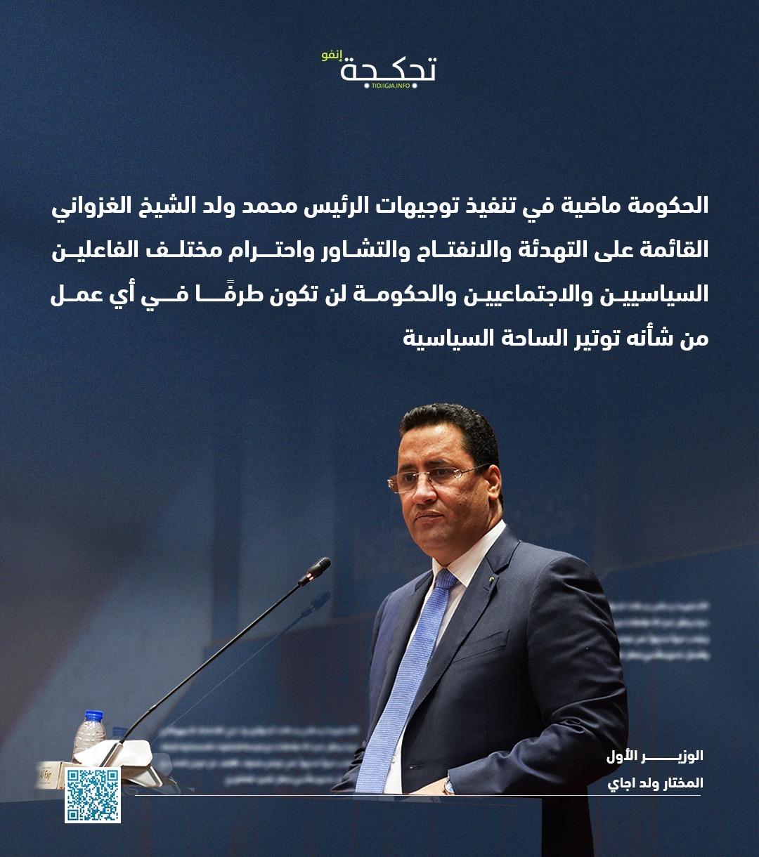 قال الوزير الأول المختار ولد اجاي، إن الحكومة ملتزمة بالتهدئة والانفتاح والتشاور والحوار، مع احترام وتقدير جميع الأطراف السياسية والاجتماعية في البلاد.