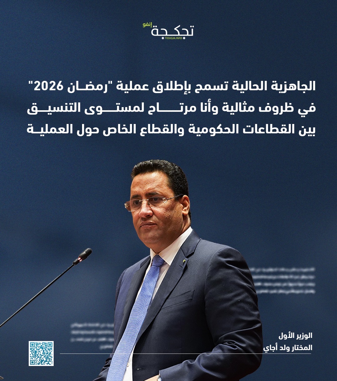 قال الوزير الأول المختار ولد أجاي إن الجاهزية الحالية تسمح بإطلاق عملية "رمضان 2026" في ظروف مثالية.