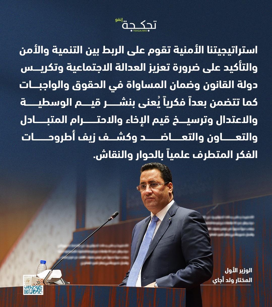 قال الوزير الأول المختار ولد أجاي إن الاستراتيجية الأمنية تقوم على الربط بين التنمية والأمن، مع التأكيد على ضرورة تعزيز العدالة الاجتماعية وتكريس دولة القانون وضمان المساواة في الحقوق والواجبات.