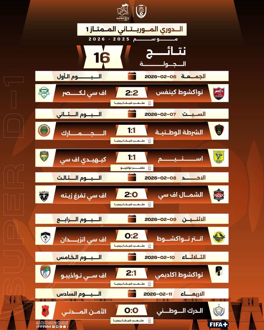 عزّز نادي أفسي نواذيبو صدارته للدوري الوطني بعد فوزه على أكاديمية نواكشوط في الجولة السادسة عشرة من البطولة، ليرفع رصيده إلى 38 نقطة دون أي خسارة حتى الآن، ويغرد وحيدًا في الصدارة.